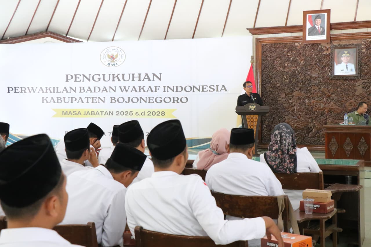 Bupati Bojonegoro Setyo Wahono bersama Forkopimda Ketua DPRD, Dandim dan Kapolres hadir dalam acara Pengukuhan Perwakilan Badan Wakaf Indonesia Kabupaten Bojonegoro, Masa Jabatan 2025-2028, Selasa (7/10) di Pendopo Malowopati Pemkab Bojonegoro.