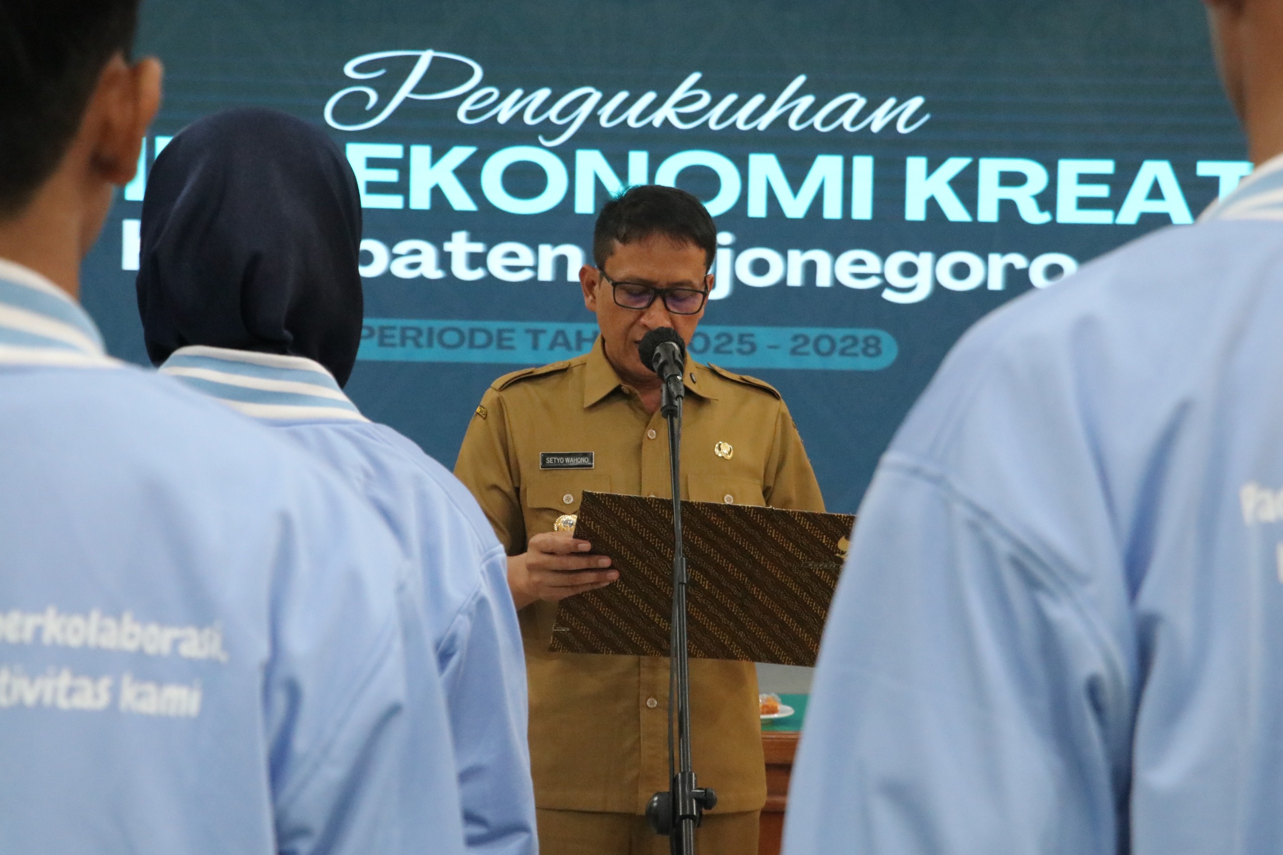 Bojonegoro – Bupati Bojonegoro, Setyo Wahono, hari ini secara resmi membuka kegiatan Bimbingan Teknis (Bimtek) Ekonomi Kreatif Kabupaten Bojonegoro sekaligus mengukuhkan anggota Komite Ekonomi Kreatif (KEK) di Ruang Angling Dharmo, Pemkab Bojonegoro (13/10).
