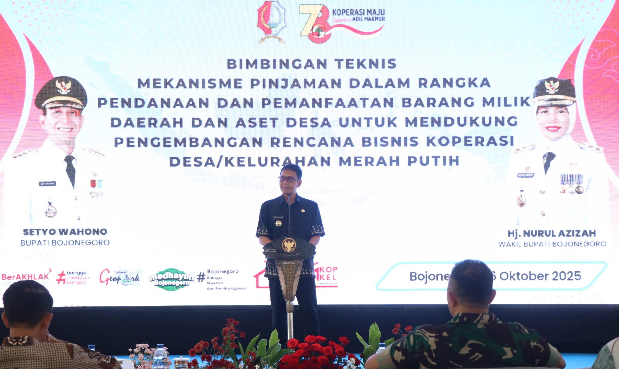 Bojonegoro, 16 Oktober 2025 — Pemerintah Kabupaten Bojonegoro melalui Dinas Perdagangan, Koperasi, dan Usaha Mikro menyelenggarakan kegiatan Bimbingan Teknis (Bimtek) Mekanisme Pinjaman dalam Rangka Pendanaan dan Pemanfaatan Barang Milik Daerah serta Aset Desa untuk Mendukung Pengembangan Rencana Bisnis Koperasi Desa/Kelurahan Merah Putih, bertempat di Pendopo Malowopati, Pemkab Bojonegoro.