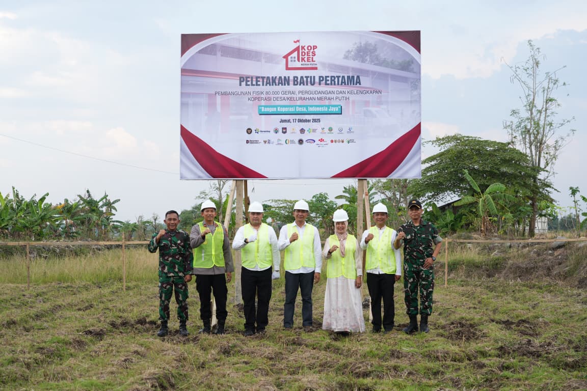 Bojonegoro – Bupati Bojonegoro Setyo Wahono bersama Wakil Bupati Bojonegoro Nurul Azizah, dan Dandim 0813 Dedy Dwi Wijayanto melakukan peletakan batu pertama peresmian pembangunan gerai, pergudangan, dan kelengkapan Koperasi Desa/Kelurahan Merah Putih. Prosesi peletakkan batu pertama dilaksanakan di area Desa Ngraseh kecamatan Dander pada Jumat (17/10).