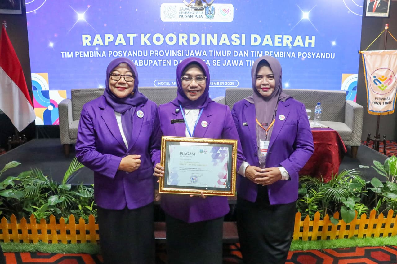 Penghargaan ini diterima langsung oleh Ketua TP Posyandu Kabupaten Bojonegoro, Ibu Cantika Wahono, didampingi Sekretaris Tim Pembina Posyandu, Ibu Evie Octavia, dalam rangkaian Rapat Koordinasi Daerah (Rakorda) Tim Pembina Posyandu Tahun 2025 yang diselenggarakan di Ruang Semeru, Aria Hotel Surabaya (04/10/25).