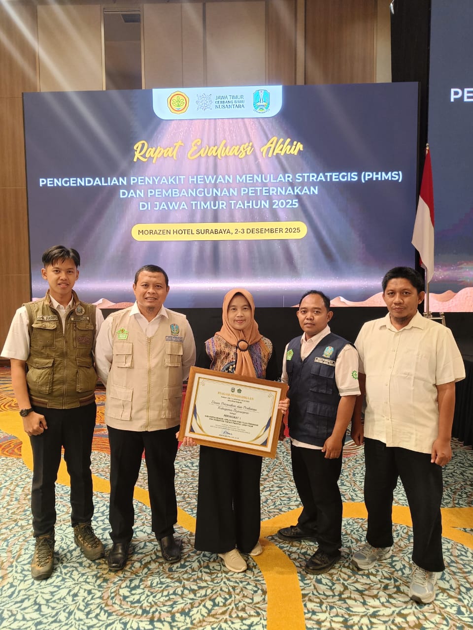 Surabaya, 2 Desember 2025 — Pemerintah Kabupaten Bojonegoro kembali membukukan prestasi yang membanggakan di tingkat Provinsi Jawa Timur. Dalam acara resmi penyerahan penghargaan yang diselenggarakan di Morazen Hotel Surabaya, Kabupaten Bojonegoro ditetapkan sebagai Peringkat I Kabupaten dengan Desa Tervaksin Penyakit Mulut dan Kuku (PMK) Terbanyak Tahun 2025, sebuah capaian yang menjadi indikator keberhasilan daerah dalam melaksanakan program vaksinasi penyakit hewan strategis.