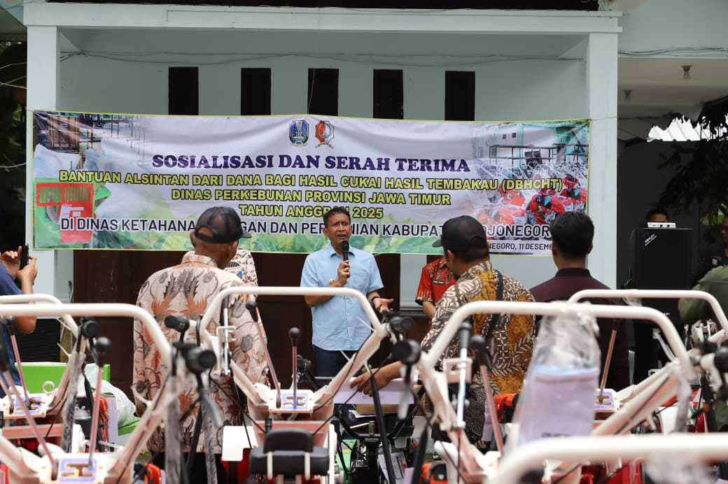 Bojonegoro - Pemerintah Kabupaten Bojonegoro terus menunjukkan komitmennya dalam memperkuat sektor pertanian sebagai salah satu pilar perekonomian daerah. Pada kesempatan penyerahan Alat dan Mesin Pertanian (Alsintan) kepada kelompok tani, Bupati Bojonegoro menyampaikan apresiasi dan terima kasih atas dukungan Pemerintah Provinsi Jawa Timur melalui Dinas Perkebunan yang telah menyalurkan bantuan alsintan dari Dana Bagi Hasil Cukai Hasil Tembakau (DBHCT), di halaman Dinas Ketahanan Pangan Dan Pertanian, Kamis (11/12).