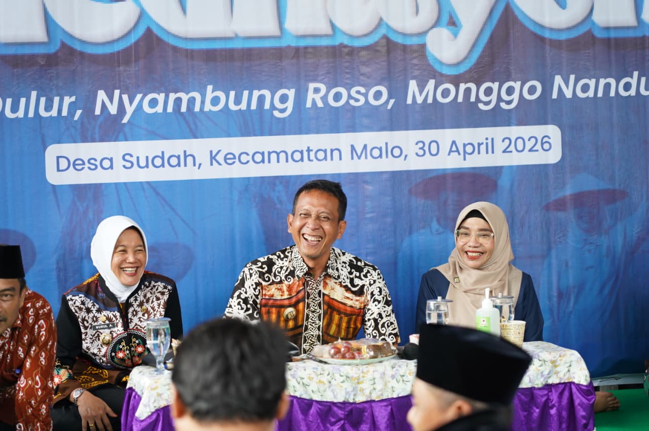 Bojonegoro – Dalam upaya menyerap langsung aspirasi masyarakat sekaligus memastikan program Pemerintah berjalan tepat sasaran, Bupati Bojonegoro Setyo Wahono di dampingi Wakil Bupati Nurul Azizah, Ketua TP PKK Cantika Wahono kembali hadir dalam acara Bupati Medhayoh, Tilik Dulur, Nyambung Roso, Monggo Nandur serta Dialog Interaktif bersama warga Desa Sudah Kecamatan Malo pada Kamis (30/04).